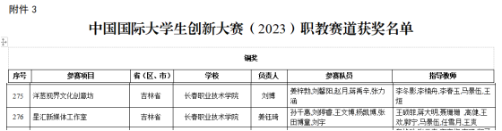 近日,教育部公布中国国际大学生创新大赛(2023)获奖名单,长春职业技术学院yl23455永利集团参赛项目荣获本次大赛职教赛道铜奖2枚,分别是《洋葱视界文化创意坊》(获奖选手:刘博、姜梓博等6名同学;指导教师:李冬影、李楠舟等)、《星汇新媒体工作室》(获奖选手:姜钰琦、孙千惠等7名同学;指导教师:王硕菲、高健等)。